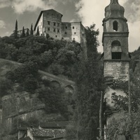 - Cartolina da Castel Madruzzo con in primo piano il campanile e il castello